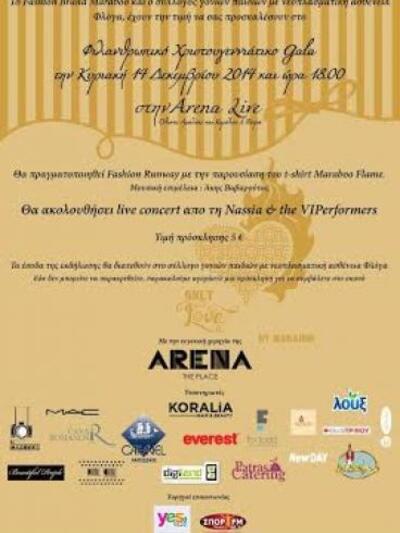 To πολυαναμενόμενο φιλανθρωπικό, χριστουγεννιάτικο σόου του πατρινού fashion brand "Maraboo" Θα φιλοξενηθεί Κυριακή 14 Δεκεμβρίου στις 6 μ.μ. στο κέντρο Arena Live, (Όθωνος Αμαλίας & Καρόλου 1) ανεβάζοντας στην πασαρέλα πάνω από 30 συμπολίτισσες για την ενίσχυση του Συλλόγου γονιών παιδιών με νεοπλασματική ασθένεια «Φλόγα».
