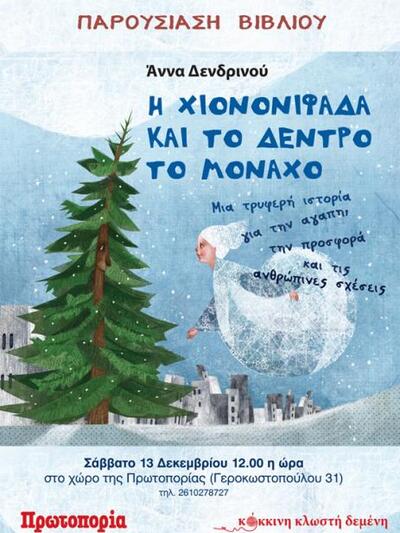 Το Σάββατο 13 Δεκεμβρίου 2014 στις 12 το μεσημέρι, η συγγραφέας Άννα Δενδρινού παρουσιάζει το νέο της παραμύθι με τίτλο "Η Χιονονιφάδα και το δέντρο το μοναχό" από τις εκδόσεις "κόκκινη κλωστή δεμένη".