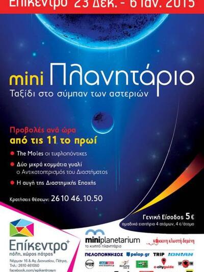 Όσον αφορά στο Μίνι Πλανητάριο, όπου η είσοδος θα κοστίζει 5 ευρώ, το Επίκεντρο+ υπόσχεται σε μικρούς και μεγάλους ένα ταξίδι στο σύμπαν των αστεριών. Από τις 23 Δεκεμβρίου 2014 έως τις 6 Ιανουαρίου 2015, με καθημερινές προβολές από τις 11 το πρωί και κάθε μια ώρα.