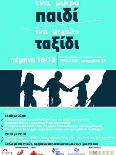 Το Κέντρο Ημέρας ασυνόδευτων ανηλίκων της Μη κυβερνητικής οργάνωσης PRAKSIS και το Κέντρο Φιλοξενίας ευάλωτων πληθυσμών & ασυνόδευτων ανηλίκων ΣΤΕΓΗ PLUS(+), θα πραγματοποιήσουν την Πέμπτη 18 Δεκεμβρίου 2014 μετά τις 18:00 το απόγευμα τη δράση με τίτλο «Ένα μικρό παιδί ένα μεγάλο ταξίδι», στον χώρο του Κέντρου Ημέρας στην οδό Τσαμαδού 38, στην Πάτρα.