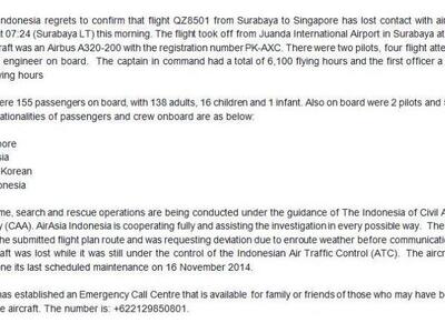 Ο πύργος ελέγχου που παρακολουθούσε την πτήση QZ8501 της αεροπορικής εταιρείας AirAsia έχασε επαφή με το αεροπλάνο στις 07:00 τοπική ώρα.