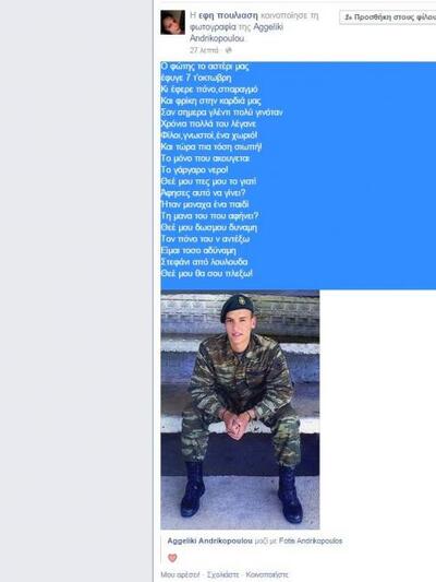 Ενα ποιημα που μιλάει για τον Φώτη Ανδρικόπουλο και για το πόσο τους λείπει ανάρτησαν στο διαδίκτυο φίλοι του, ανήμερα των Φώτων. "Σαν σήμερα θα γινόταν γλέντι στο σπίτι του. Και τώρα πια τόση σιωπή.." αναφέρεται εκτός των άλλων, σε λίγα στιχάκια που γράφτηκαν σε ανάμνηση του Φώτη που χάθηκε τόσο νωρίς και τόσο άδικα. Στο δυστύχημα που σημειώθηκε στις 7 Οκτωβρίου και όταν έσκασε βλήμα μέσα σε σωλήνα εκτόξευσης όλμου, κατά τη διάρκεια άσκησης στο πεδίο βολής Γλαφυρών Βόλου.