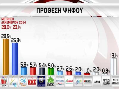 Σύμφωνα με την μέτρηση που παρουσιάστηκε στο Action24, στην πρόθεση ψήφου εθνικών εκλογών με αναγωγή επί των εγκύρων, ο ΣΥΡΙΖΑ λαμβάνει 30,5% (ακριβώς το ίδιο ποσοστό με την προηγούμενη δημοσκόπηση) και η ΝΔ 27% (έναντι 26,5% που είχε στην προηγούμενη έρευνα). Την τρίτη θέση μοιράζονται το ΠΑΣΟΚ-Δημοκρατική Παράταξη, το Ποτάμι και η Χρυσή Αυγή με 6%. Ακολουθεί το ΚΚΕ με 5,5%, οι ΑΝΕΛ με 3% και το νεοσύστατο κόμμα Κίνημα Δημοκρατών Σοσιαλιστών του Γιώργου Παπανδρέου με 2,5%.