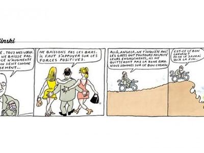 Στο γελοιογραφικό σκίτσο, πρωταγωνιστής είναι ο Γάλλος Pρόεδρος, Φρανσουά Ολάντ, ο οποίος κάνει αμέριμνος ποδήλατο. Καθώς πηγαίνει τη βόλτα του με ποδήλατο που έχει τη μορφή του 2015, μιλάει στο τηλέφωνο με την Γερμανίδα καγκελάριο, ;Aνγκελα Μέρκελ, στην οποία λέει χαρακτηριστικά, «Γειά σου Άνγκελα. Μην ανησυχείς! Οι Έλληνες σέβονταν πάντα τις δεσμεύσεις τους, δεν θα αποχωρήσουν από την Ευρωζώνη. Είμαστε στο σωστό δρόμο».