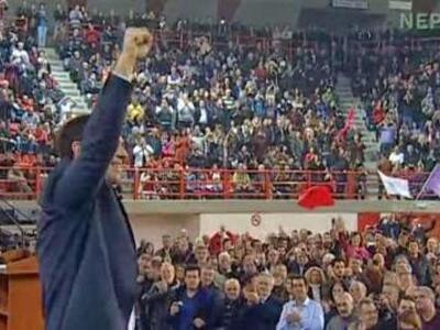 Στο τέλος της ομιλίας του κάλεσε μαζί του στη εξέδρα τον Κάγιο Λάρα, συντονιστή της Ενωμένης Αριστεράς της Ισπανίας, που παρευρέθηκε στη συγκέντρωση και παρακολούθησε την ομιλία του και τους 11 υποψήφιους βουλευτές του Νομού Αχαΐας".
