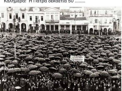 Προεκλογική συγκέντρωση του Γεώργιου Παπανδρέου, υπό βροχή, στην πλατεία Γεωργίου της Πάτρας , δεκαετία του 1950...