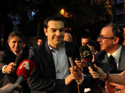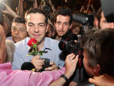 6 Μαϊου 2012: Φτάνει στο εκλογικό κέντρο του ΣΥΡΙΖΑ, για να πανηγυρίσει το μεγάλο άλμα. Ο ΣΥΡΙΖΑ, έχει συγκεντρώσει 16,79% και είναι δεύτερο κόμμα, με πρώτη την ΝΔ που έχει συγκεντρώσει 18,85%. Η χαρά του είναι ζωγραφισμένη στο πρόσωπό του.