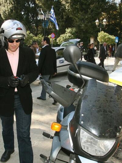 4 Μαρτίου 2008: επωχούμενος σε μηχανή φτάνει στο Προεδρικό Μέγαρο για την πρώτη του συνάντηση με τον Πρόεδρο της Δημοκρατίας ως αρχηγός κόμματος.
