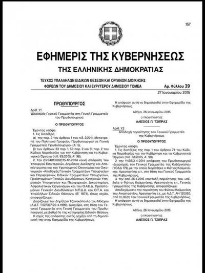 Αυτό είναι το πρώτο ΦΕΚ με το οποίο τοποθετείται ο Δημήτρης Τζανακόπουλος στη θέση του Γενικού Γραμματέα στη Γενική Γραμματεία του Πρωθυπουργού.