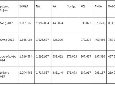 Στον πίνακα με τους αριθμούς των ψήφων και τα συγκριτικά στοιχεία φαίνεται η αλματώδης ανάπτυξη των δυνάμεων του ΣΥΡΙΖΑ, ο οποίος ξεκίνησε από 315.665 ψήφους στις βουλευτικές εκλογές του 2009, για να φτάσει στους 2.244.465 καταγράφοντας άνοδο 727.831 από τις πρόσφατες ευρωεκλογές, πάνω από μισό εκατομμύριο ψήφους σε σχέση με τις βουλευτικές του Ιούνη του 2012 και πάνω από ένα εκατομμύριο σε σχέση με το Μάη του 2012. Αντίστοιχα εντυπωσιακή είναι και αύξηση των ποσοστών του, που από το 4,60% των εκλογών του 2009 βρέθηκε στο 36,34% της Κυριακής κερδίζοντας την ψήφο του 1/3 των πολιτών.
