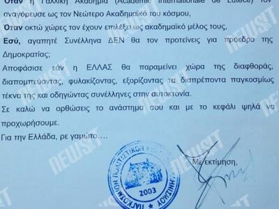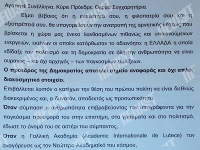 "Επιβάλλεται ο κατέχων τη θέση του πρώτου πολίτη να είναι διεθνώς διακεκριμένος και, ει δυνατόν, αποδεκτός ως προωπικότητα. Εσύ, αγαπητέ Συνέλληνα ΔΕΝ θα τον προτείνεις για πρόεδρο της Δημοκρατίας;" γράφει μεταξύ άλλων στην επιστολή του προς των πρωθυπουργό ο Τριαντάφυλλος Καραγιάννης.