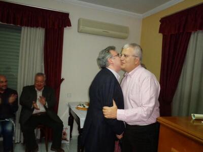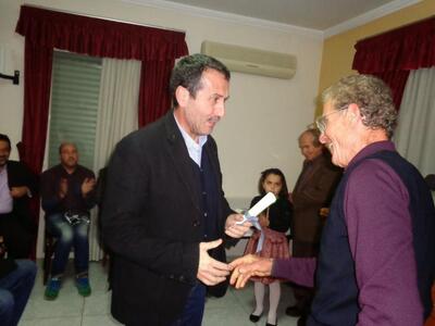 Η στιγμή που ο Κώστας Σπαρτινός επικεφαλής της δημοτικής παράταξης ΡΑΠ Πάτρα Ανθρώπινη Πόλη βραβεύει τον Κίμων Αποστολόπουλο για την συμμετοχή του σε 30 μαραθωνίους δρόμους.
