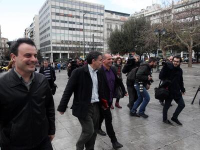 Θερμές εκδηλώσεις υποστήριξης συνάντησε ο υπουργός Οικονομικών Γιάννης Βαρουφάκης περπατώντας προ ολίγου στην πλατεία Συντάγματος. Ο υπουργός έφυγε από την σύσκεψη υπό τον πρωθυπουργό στη Βουλή και κατευθύνθηκε περπατώντας και χωρίς αστυνομική φρουρά στο γραφείο του στο υπουργείο Οικονομικών.