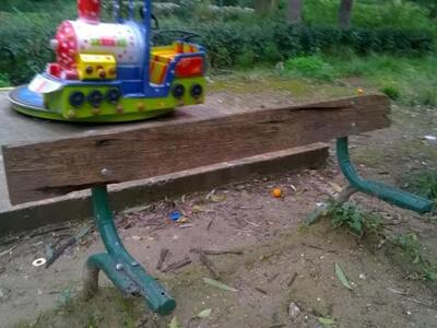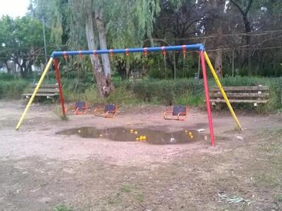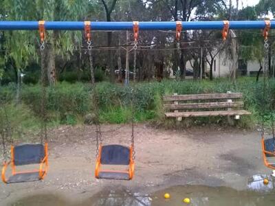 Κούνιες σπασμένες και πεπαλαιωμένες και άλλες που λείπουν. Σωροί αοπό ξερά χόρτα, σπασμένα παγκάκια και σκουπίδια συναντά κανείς σε μια απλή βόλτα στον κήπο.