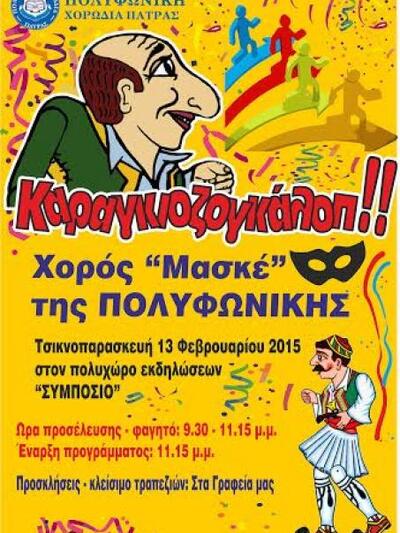 Στο τελικό στάδιο βρίσκονται οι προετοιμασίες για την πολυαναμενόμενη και με ιδιαίτερο ενδιαφέρον, καθιερωμένη ΑΠΟΚΡΙΑΤΙΚΗ ΧΟΡΟΕΣΠΕΡΙΔΑ ΜΑΣΚΕ της ΠΟΛΥΦΩΝΙΚΗΣ, που θα πραγματοποιηθεί την ΤσικνοΠΑΡΑΣΚΕΥΗ, 13 Φεβρουαρίου, στον πολυχώρο ‘’ΣΥΜΠΟΣΙΟ’’ [πάροδος Αθηνών και Κανελλοπούλου, κάτω από τις γραμμές του τρένου].