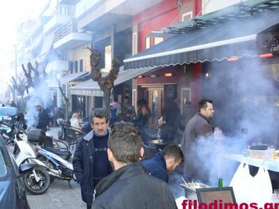Τα κεντρικά καφέ και ψησταριές της πόλης γέμισαν το μεσημέρι από κόσμο που έγινε μια μεγάλη παρέα και απόλαυσε μεζέδες τσικνιστούς και κρασάκι, υπό τους ήχους χαρούμενης μουσικής αλλά και live σε κάποια μαγαζιά.
