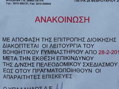Όταν νωρίς το πρωί πήγαν για τις προπονήσεις τους στο χώρο βρήκαν τις πόρτες κλειστές και θυροκολλημένη μια ανακοίνωση απο την επιτροπή διοίκησης που ανέφερε οτι απο σήμερα διακόπτεται η λειτουργία του χώρου λόγω επικινδυνότητας μέχρι να γίνουν οι απαιτούμενες επισκευές...