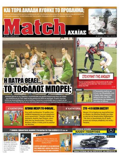 Ρεπορτάζ και φωτογραφία από την εφημερίδα Match Αχαϊας, δείτε το σημερινό πρωτοσέλιδο: