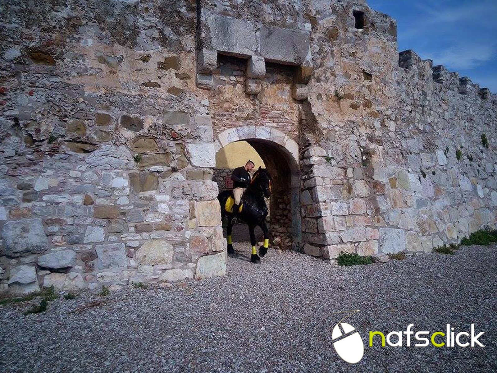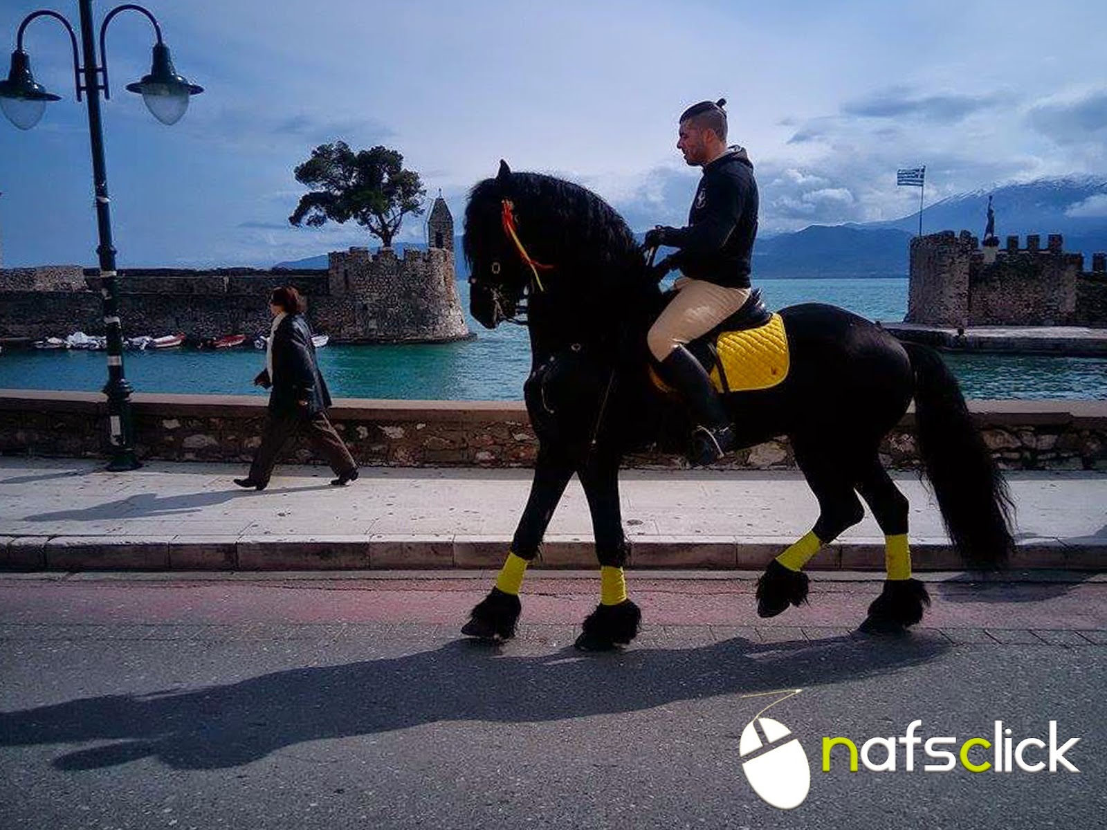 Δείτε φωτογραφίες με το πανέμορφο άλογό του, ράτσας Friesian με τα εντυπωσιακά χαρακτηριστικά, στο Λιμάνι της Ναυπάκτου.
