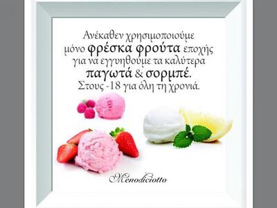 Πρόκειται για το παγωτό της ιταλικής εταιρείας Menodiciotto, το οποίο λόγω της ιδιαιτερότητας του ότι δεν περιέχει συντηρητικά, δεν θα εκτίθεται σε βιτρίνες, ως συνήθως, και ο κόσμος θα έχει τη δυνατότητα να το δοκιμάζει πριν το αγοράσει.