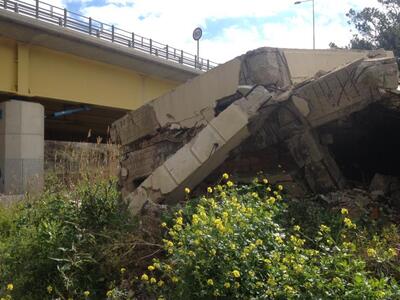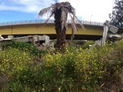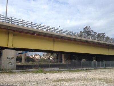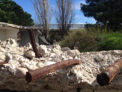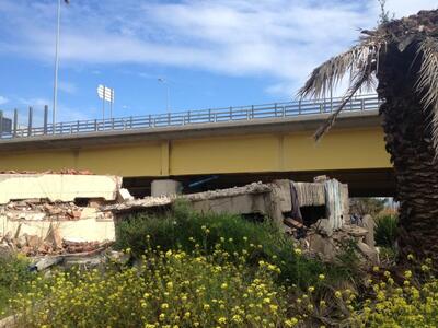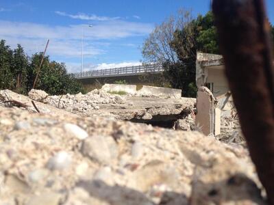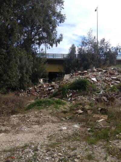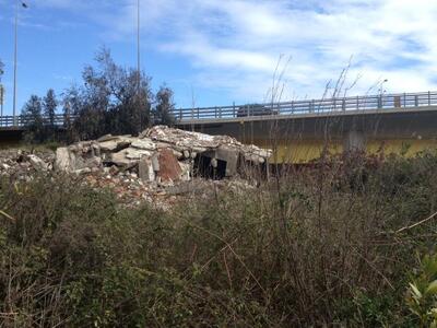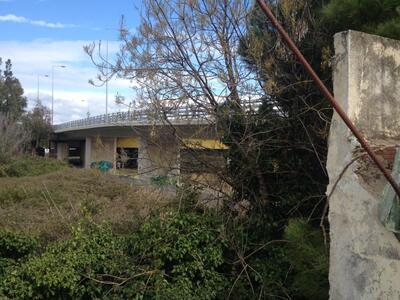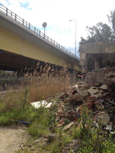 Πρόκειται για απαλλοτριωμένες εκτάσεις λίγα μέτρα από τα "πόδια" της γέφυρας και κτίσματα τα οποία κατεδαφίστηκαν. Οπως τα γκρέμισαν ωστόσο, ετσι τα άφησαν. Κανείς δεν ανέλαβε να απομακρύνει τα μπάζα που προκλήθηκαν. Ίσως γιατι ο μικρός δρόμος απο τον οποίο γίνονται ορατά δεν έχει μεγάλη κίνηση, καθώς εξυπηρετεί μονάχα κάποιες οικίες της περιοχής.
