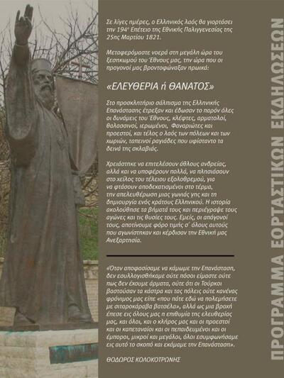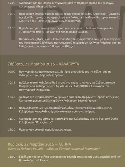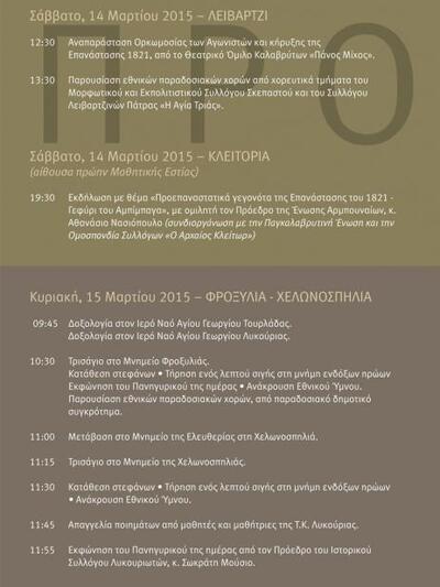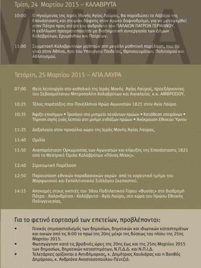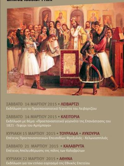 Ξεκινούν το Σάββατο, 14 Μαρτίου, με λαμπρότητα, οι εκδηλώσεις του Δήμου Καλαβρύτων, για την απόδοση τιμής και μνήμης στα προεπαναστατικά γεγονότα της 14-03-1821, στοΛΕΙΒΑΡΤΖΙ, στη ΦΡΟΞΥΛΙΑ – ΧΕΛΩΝΟΣΠΗΛΙΑ, την Κυριακή, 15 Μαρτίου 2015, για τα προεπαναστατικά επεισόδια της 16-03-1821, στα ΚΑΛΑΒΡΥΤΑ, το Σάββατο, 21 Μαρτίου 2015, για την επέτειο της απελευθέρωσης της πόλης, στηνΑΘΗΝΑ, την Κυριακή, 22 Μαρτίου 2015, για τον ετήσιο εορτασμό της Εθνικής Επετείου και στην ΑΓΙΑ ΛΑΥΡΑ, την Τετάρτη, 25 Μαρτίου 2015, για την επέτειο της Εθνικής μας Παλιγγενεσίας.