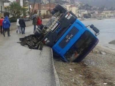 Απίστευτο ντελαπάρισμα μπετονιέρας, στον παραλιακό της Αιγείρας Αχαΐας. Το ταλαιπωρημένο, λόγω διάβρωσης, οδόστρωμα δεν άντεξε το βάρος του οχήματος και υποχώρησε, με αποτέλεσμα η μπετονιέρα να ντελαπάρει.