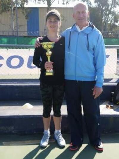 H νεαρή αθλήτρια Χαραλαμπίδη Γαβριέλλα απο την Πάτρα, αγωνίστηκε στην κατηγορία U14 και με πολύ καλές εμφανίσεις κατέκτησε την 1η θέση ανάμεσα σε 32 αθλήτριες. Η Γαβριέλλα βρίσκεται στην 2η θέση της Πανελλήνιας κατάταξης στην κατηγορία της (U14) και στόχος της για το 2015 είναι η κατάκτηση της 1ης θέσης. Στην φώτο με τον προπονητή της Θεοδωρόπουλο Παναγιώτη του IN OUT COURT TENNIS ACADEMY.