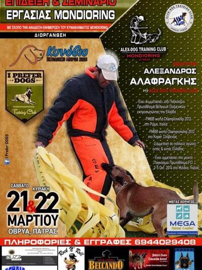 Το διήμερο 21 & 22 Μαρτίου, στην Οβρυά Πάτρας, το ξενοδοχείο σκύλων "Κυνόβιο" συνδιοργανώνει Επίδειξη και Σεμινάριο Mondioring με εισηγητή τον διακεκριμένο στην κατηγορία του Αλέξανδρο Αλαφραγκή.