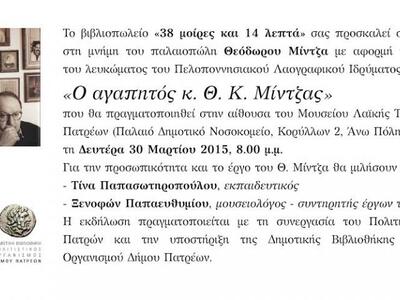 Μια βραδιά αφιερωμένη στη μνήμη του συλλέκτη και παλαιοπώλη Θεόδωρου Μίντζα (1934 – 2012) διοργανώνει αυτή τη Δευτέρα 30 Μαρτίου 2015 στις 20.00 το βράδυ το βιβλιοπωλείο «38 μοίρες και 14 λεπτά» του Ανδρέα Τσιλίρα και του Λεωνίδα Πανόπουλου που βρίσκεται στην οδό Κολοκοτρώνη.