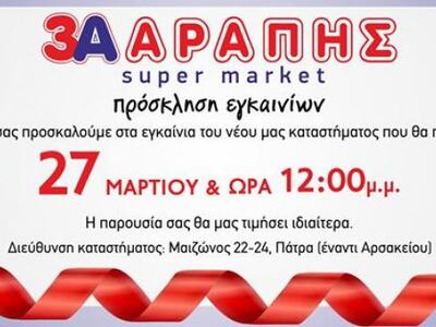 Αξίζει να σημειωθεί πως την Παρασκευή 27 Μαρτίου 2015 στις 12 το μεσημέρι θα γίνουν τα εγκαίνια του νέου καταστήματος του ομίλου σούπερ μάρκετ «Αράπης» στην Πάτρα, το οποίο βρίσκεται στην οδό Μαιζώνος 22-24, έναντι παλαιού κτιρίου Αρσακείου. Το νέο κατάστημα περιμένει τους Πατρινούς με πολλές μοναδικές προσφορές.