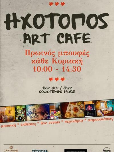 Ο Ηχοτοπος art στρώνει τον Κυριακάτικο πρωινό μπουφέ με γλύκες και αλμυρές γεύσεις, χειροποίητα εδέσματα και γευστικούς χυμούς. από τις 10 το πρωί μέχρι τις 2.30 το μεσημέρι. Η κατανάλωση είναι ελεύθερη με κόστος ανά άτομο της τάξης των5 ευρω μ