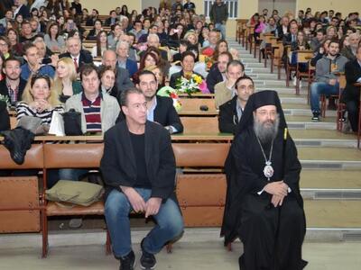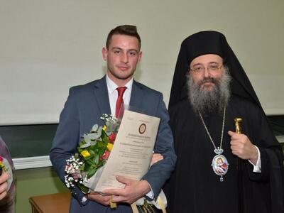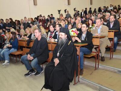 Στην τελετή ορκωμοσίας στο κατάμεστο από κόσμο αμφιθέατρο παρέστη και ευλόγησε την εκδήλωση ο σεβασμιότατος Μητροπολίτης Πατρών κ.κ. Χρυσόστομος.