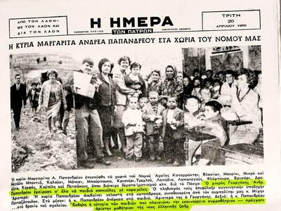 “... Ο μικρός Γεωργάκης Ανδρ. Παπανδρέου εμοίρασε σ’ όλα τα παιδιά σακκούλες με καραμέλες... Δεξιά η κα Παπανδρέου στο θρανίο του σχολείου. Έκδηλη η ευτυχία των παιδιών που πλαισιώνει την «καινούργια συμμαθήτρια» - πράγματι άριστη μαθήτριαν της νέας ελληνικής ζωής...”