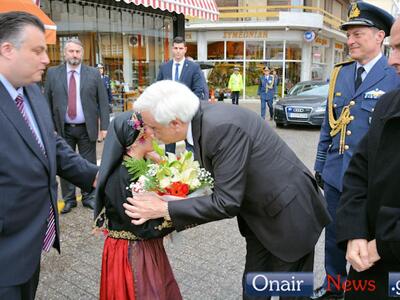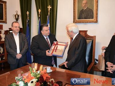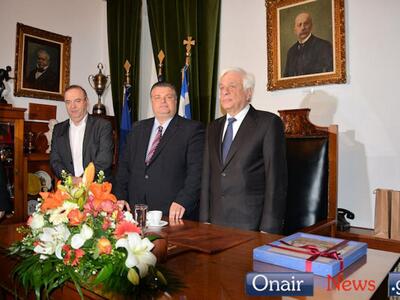 Ο Δήμαρχος Μεσολογγίου κ.Καραπάνος τον υποδέχτηκε στην Πινακοθήκη μαζί με τους επισήμους και για αναμνηστικό δώρο απο την πόλη του πρόσφερε ένα έργο του Βαγγέλη Ρόμπολα.