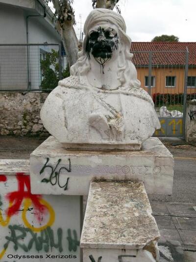 "Θύμα" τους αυτή τη φορά η προτομή του Οδυσσέα Ανδρούτσου στην πλατεία του Βλατερού.