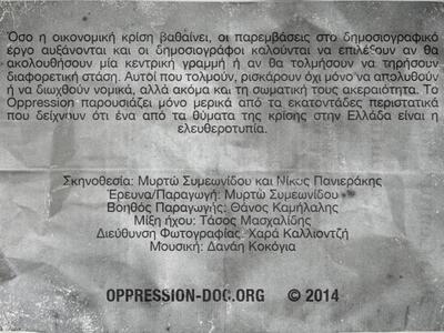 Όσο η οικονομική κρίση βαθαίνει, οι παρεμβάσεις στο δημοσιογραφικό έργο αυξάνονται και οι δημοσιογράφοι καλούνται να επιλέξουν αν θα ακολουθήσουν μία κεντρική γραμμή ή αν θα τολμήσουν να τηρήσουν διαφορετική στάση. Αυτοί που τολμούν, ρισκάρουν όχι μόνο να απολυθούν ή να διωχθούν νομικά, αλλά ακόμα και τη σωματική τους ακεραιότητα. To Oppression παρουσιάζει μόνο μερικά από τα εκατοντάδες περιστατικά που δείχνουν ότι ένα από τα θύματα της κρίσης στην Ελλάδα είναι η ελευθεροτυπία.