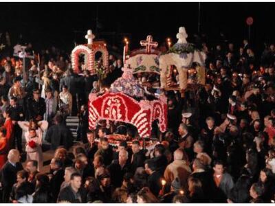 Το βράδυ της Μ. Παρασκευής γίνεται στον κεντρικό δρόμο της πόλης, με κατάληξη την παραδοσιακή, ενετικού στυλ, κεντρική πλατεία, η περιφορά των επιταφίων των ενοριών, συνοδεία Φιλαρμονικής. Το Μ. Σάββατο το πρωί, η Φιλαρμονική παίζει στους δρόμους της πόλης χαρούμενους σκοπούς, ενώ οι νοικοκυρές πετούν και σπάζουν έξω από τα σπίτια τους διάφορα πήλινα αγγεία (το κομμάτι).