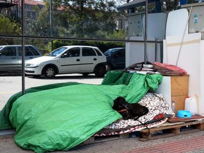 Σε εκείνη τη μικρή γωνιά, του πολυτελέστατου σταθμού, βρίσκεται το «βασίλειό» του. Δυο κουβέρτες, ένα σεντόνι, δυο μαξιλάρια και ένας μουσαμάς που τον προστατεύει από το κρύο και τη βροχή. Λίγο παραπέρα, ένα μπολ με νερό για τον πιστό του σύντροφο, τον σκύλο του.