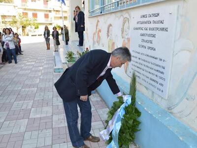 Έτσι, ο αντιδήμαρχος Παιδείας και Αθλητισμού Ανδρέας Αθανασόπουλος, κατέθεσε στεφάνια στις μαρμάρινες πλάκες που έχουν τοποθετηθεί από τον Δήμο Πατρέων, στο 26ο -31ο Δημοτικό Σχολείο Αγίας Σοφίας και στο 15ο και 17ο Δημοτικό Σχολείο Δροσιάς και μίλησε στους μαθητές, για τη σημασία της ημέρας, αλλά και του αγώνα των ανδρών και των γυναικών που δεν έσκυψαν το κεφάλι στη χούντα των συνταγματαρχών.