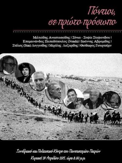 Ο «Φάρος Ποντίων Πατρών», με αφορμή τη συμπλήρωση 30 χρόνων δράσης του στην Πάτρα, διοργανώνει σε συνεργασία με την Α.Μ.Κ.Ε. «Πλήρωμα 94» ένα θεατρικό αναλόγιο με τίτλο «Πόντιοι, σε πρώτο πρόσωπο», στο πλαίσιο των εκδηλώσεων που αφορούν τη Γενοκτονία του ποντιακού ελληνισμού. Θα παρουσιαστεί στο Συνεδριακό και Πολιτιστικό Κέντρο του Πανεπιστημίου Πατρών, την Κυριακή 26 Απριλίου, ώρα 20.00, με ελεύθερη είσοδο. Εντάσσεται στις εκδηλώσεις του Πανεπιστημίου Πατρών «Πολιτιστικά 2015» και τελεί υπό την αιγίδα της Περιφέρειας Δυτικής Ελλάδας.