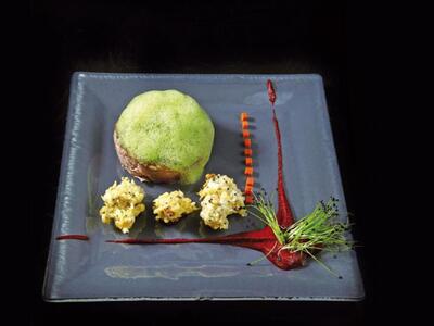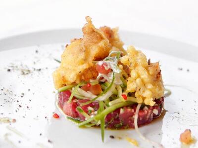 Κορυφαίο πιάτο: Ριζότο με παλαιωμένο ρύζι Aquerellο, μανιτάρια enoki τεμπούρα, μοσχάρι τατάκι με λάδι σοκολάτας και αβοκάντο με κάρι
