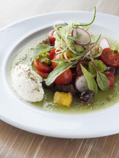 Κορυφαίο πιάτο: Ο Κήπος του σεφ (εδώδιμο τοπίο από λαχανικά, μυρωδικά και πέταλα λουλουδιών, βινεγκρέτ πετιμεζιού, πανακότα κρεμμυδιού, μαγιονέζα φουντουκιού )