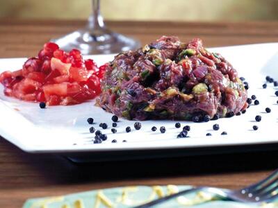 Κορυφαίο πιάτο: Πέτουλες με βετούλι κοκκινιστό, γραβιέρα Νάουσας και πασκιτάν.