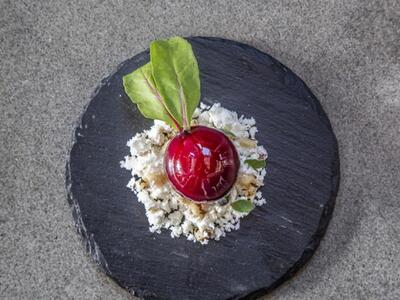 Κορυφαίο πιάτο: Πανσέτα σιγοψημένη, καραμελωμένη με ψητά μήλα και black pudding σε κυβάκια
