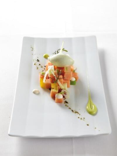 Κορυφαίο πιάτο: Καραβίδες σε σάλτσα από λευκή σοκολάτα με λάιμ, τζίντζερ, χαβιάρι χρυσής ρέγκας και καρπάτσιο από πράσινο μήλο