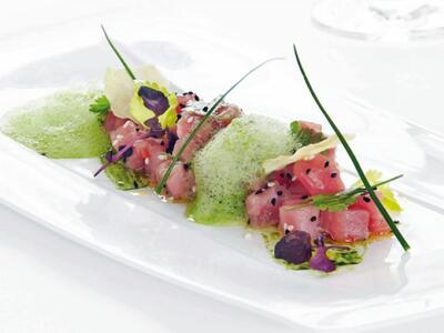 Η κομψή κουζίνα του Τάσου Μαντή που δούλευε ως sous chef στο βελγικό εστιατόριο «Hof Van Cleve» (3 αστέρια Michelin ) ανανεώνει το γαστρονομικό σκηνικό του βραβευμένου εστιατορίου, με μια κουζίνα που έχει πολλά ελληνικά αλλά και μεσογειακά στοιχεία. Χαρακτηριστική ιδέα το σάντουιτς μπισκότων ελιάς, με παγωτό ελαιόλαδο και σφαίρες από ζελέ lime να ηλεκτρίζουν τις γεύσεις.