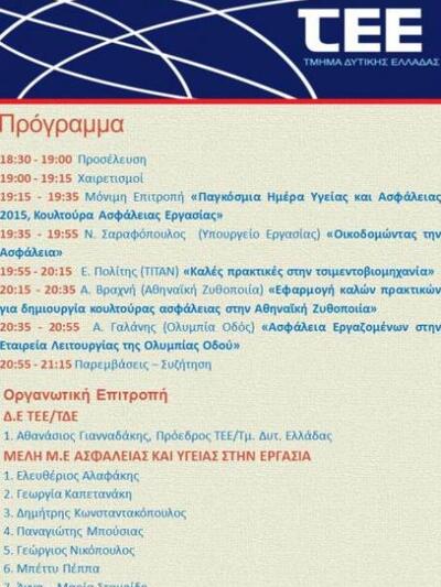Με αφορμή την Παγκόσμια Ημέρα για την Ασφάλεια και Υγεία στην Εργασία που έχει θεσπιστεί να τιμάται στις 28 Απριλίου, το Τεχνικό Επιμελητήριο Ελλάδας, Τμήμα Δυτικής Ελλάδας διοργανώνει μία ενδιαφέρουσα όπως αναμένεται, Ημερίδα την Δευτέρα 27/4/2014, στις 18:30 το απόγευμα, με τίτλο «Δημιουργώντας κουλτούρα πρόληψης στην Ασφάλεια &Υγεία της Εργασίας».