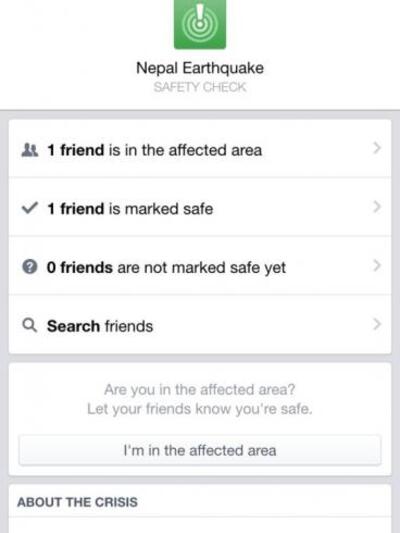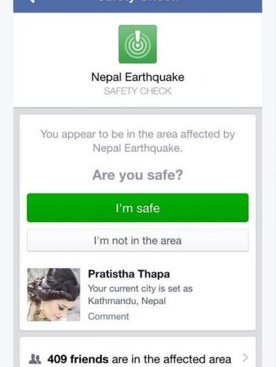 Στην προκειμένη περίπτωση, αν κάποιος χρήστης του Facebook έχει δηλώσει ως τόπο κατοικίας το Κατμαντού ή κάποια άλλη πόλη κοντά στο επίκεντρο του σεισμού, λαμβάνει μια ειδοποίηση με την ερώτηση αν είναι ασφαλής. Απατώντας θετικά οι online φίλοι του ενημερώνονται σχετικά, μέσω μιας σελίδας που περιέχει πληροφορίες για το καταστροφικό γεγονός.