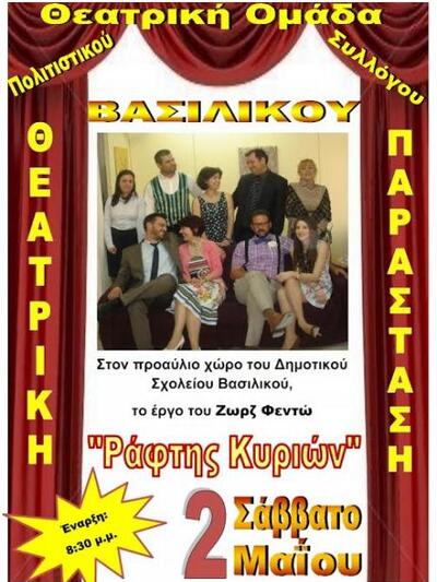 Η θεατρική ομάδα του Πολιτιστικού Συλλόγου του Βασιλικού Αχαΐας ανεβάζει αυτό το Σάββατο 2 Μαΐου 2015 την Γαλλική φαρσοκωμωδία «Ράφτης Κυριών» του Ζωρζ Φευντώ.